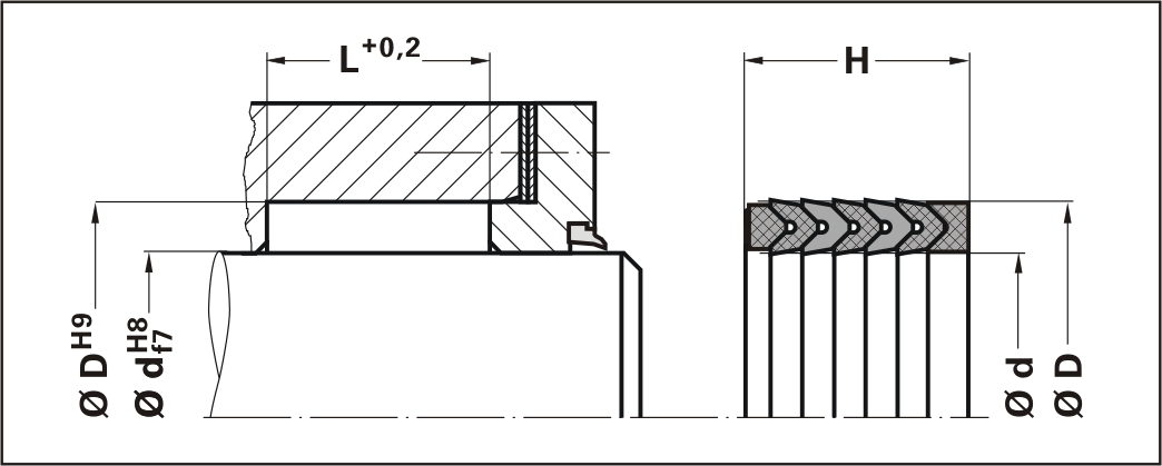 Fabric chevron sealing set for complicated operating conditions, standard series for pressures up to 350 bar in hydraulic applications.