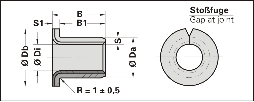 Radial slide bearing with flange, of a metal composite and a sliding layer of PTFE/lead for maintenance-free operation, general applications.