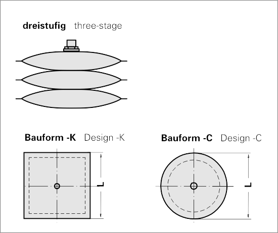 Circular lifting cushion for small fitting areas, three-stage. Available in square and circular versions. Application: Clamping, shutting off, pressing, damping, gripping, guiding, pushing, sealing, pressing, flanging, handling, lifting, compressing, pushing, blocking, moving or insulating.